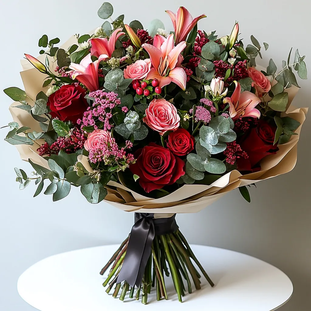 Oh man, this bouquet’s like a sunset in your hands—vibrant pinks from that showstopper anthurium mixing with creamy whites, soft peonies, and pops of orange roses. Throw in some purple accents and lush eucalyptus for that wild, fresh vibe. It’s perfect for surprising your bestie on a tough day or adding romance to date night… you know, that ‘wow, you get me’ moment that lights up their face.